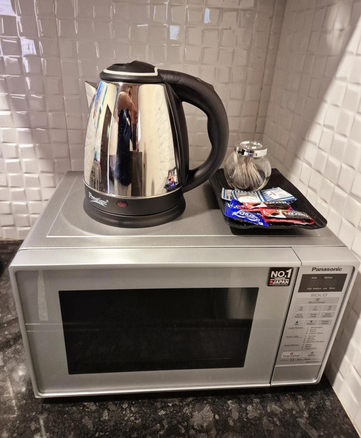 There is a coffee shop, and a grocery delivery service is also available.